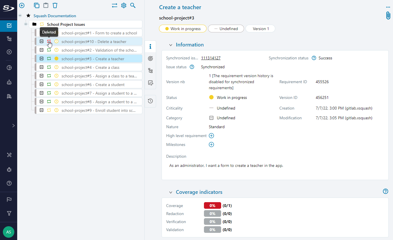 - red icon: the requirement is no longer updated via synchronization because the matching GitLab issue was deleted in GitLab;